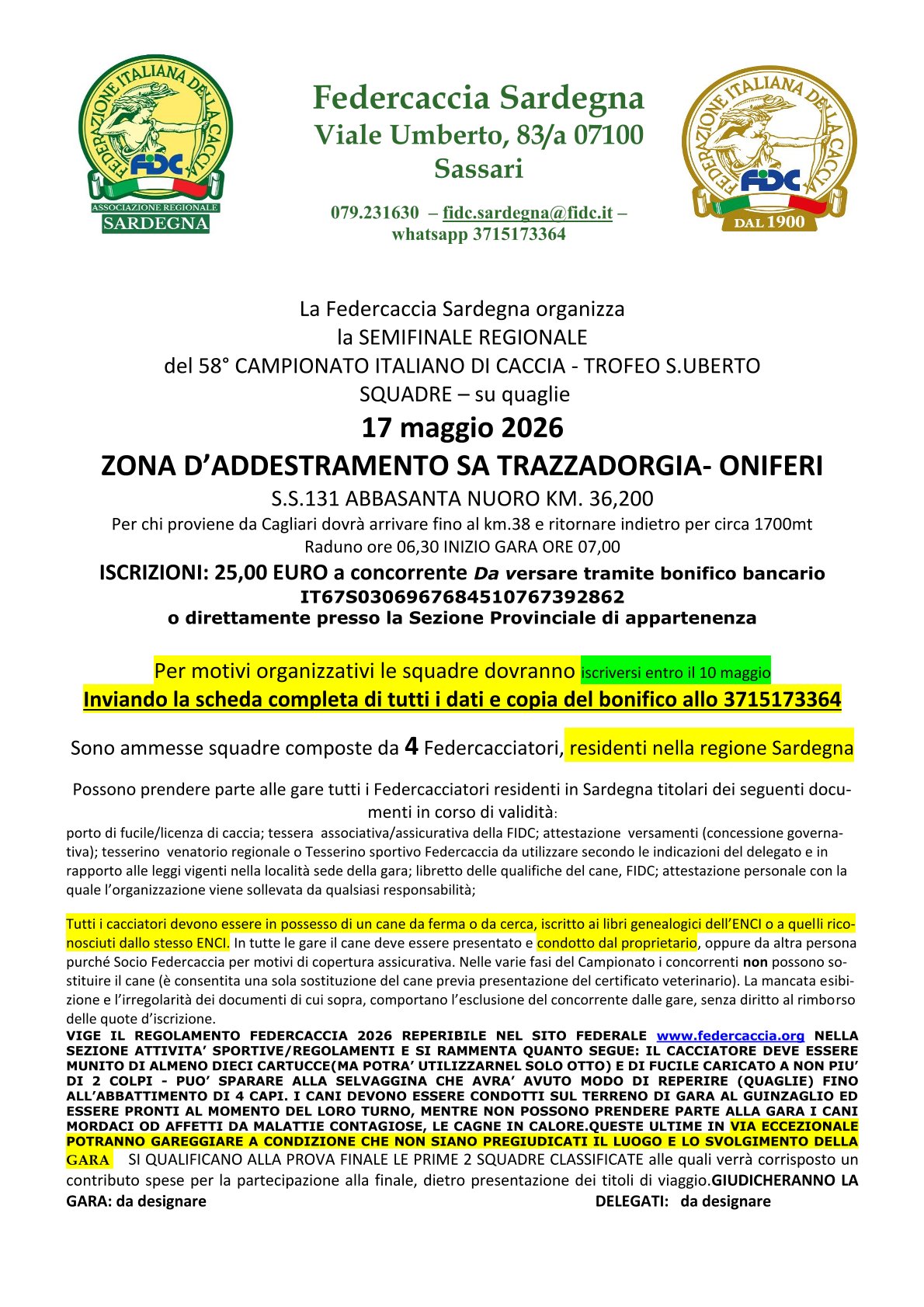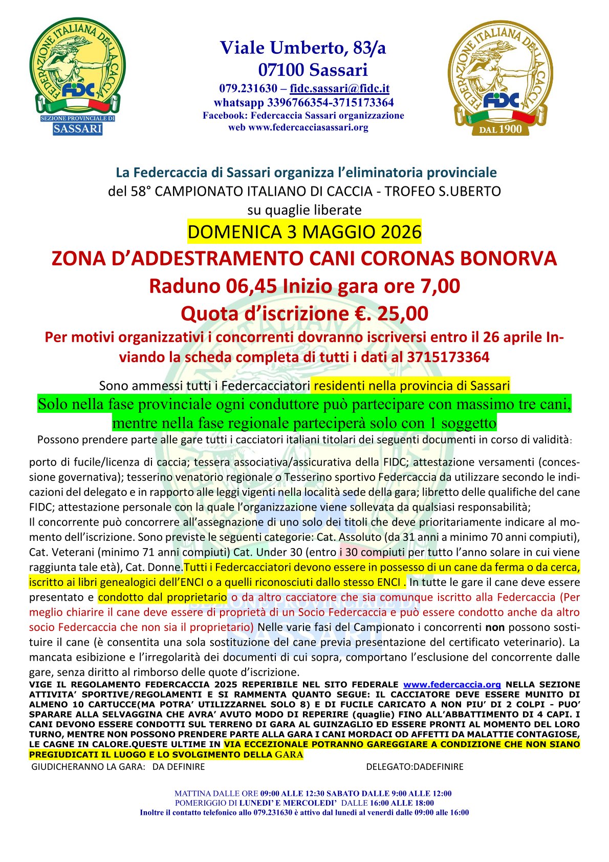 Carissimi iscritti e non, ecco il nuovo sito internet della Sezione Provinciale di Sassari della Federcaccia. Qui potrete trovare le ultime news che la Federazione vuole comunicarvi. Siamo inoltre a vostra disposizione per fornire gratuitamente agli utenti, tramite posta elettronica, consulenze legali sulla legislazione venatoria, nonché consulenze sulla cinofila e di carattere veterinario. Ricordiamo che nel nostro ufficio di viale Umberto, 83/a, è a vostra disposizione personale qualificato per cercare di risolvere qualunque vostro problema in relazione all'attività venatoria, cinofila e tiro.
